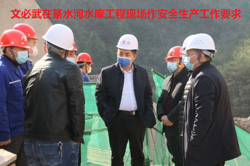 在篆水河水库工程现场,文必武详细了解水库的建设进度,听取了工程负责人关于安全生产、建设过程中存在的困难及问题的情况汇报,并就做好安全生产工作提出几点要求,一是加强现场施工作业人员的安全教育,完善安全生产操作规程,切实抓好安全生产工作;二是加强工程现场管理,严格落实各项安全防护措施,将安全生产责任制落到实处;三是在保质保量的情况下,根据实际情况优化施工组织计划,倒排工期,切实加快工程建设力度。