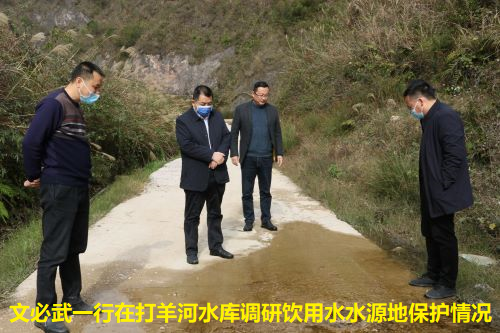 在打羊河水库、旧州镇小村村(印地坝水库淹没区),文必武认真听取相关负责人关于打羊河水库工程前期工作推进情况及印地坝水库淹没区水源地保护情况的汇报,并对精心谋划好“十四五”时期水利规划项目,抓紧推进工程项目前期工作,尽快形成有效投资作出了具体指示。在现场查印地坝水库淹没区小村村附近饮用水水源地的保护情况时指出,饮用水水源保护工作,事关人民群众身体健康和生命安全,相关部门必须坚持以人民为中心的发展理念,采取有效措施,扎实做好水源安全保障工作。