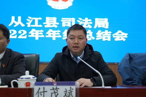 县委常委、县委政法委书记付茂斌充分肯定了我县司法行政系统2022年取得的各项成绩。他指出,2023年是全面贯彻落实党的二十大精神开局之年,是实施“十四五”规划承上启下关键之年,也是我县全方位推动经济社会高质量发展的关键之年,全县司法行政系统更要踔厉奋发、勇毅前行。他强调,在赶考路上,司法行政系统要深入学习贯彻党的二十大精神,始终坚持党的领导强化政治建设,紧扣业务工作推动提升质效,服务中心大局主动担当作为,严格干部管理打造过硬队伍,奋力谱写新时代司法行政工作新篇章。(从江县司法局:徐玉玲)