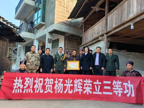 1月29日,从江县人武部、县退役军人事务局、贵州农村商业银行从江支行联合开展“新春送喜报”活动,与相关乡镇党政主要领导、分管领导及乡镇、村(居)退役军人服务站,先后为荣立三等功现役军人丙妹镇长寨村的杨光辉、加榜乡尧贵村的欧孟南家属带去春节祝福和问候,送立功喜报、功臣牌匾及慰问金。村民们自发吹着芦笙、敲锣打鼓、燃放烟花炮竹,用最淳朴而隆重的方式表达对现役军人立功的崇敬和爱戴,也营造浓厚的氛围,为节日增添了光彩。