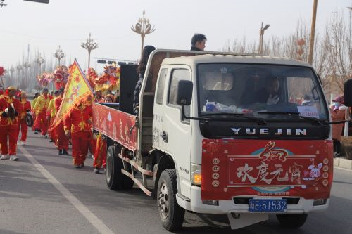 随后,鞭炮齐鸣,锣鼓响起,“咚咚锵,咚咚锵……”红红火火的社火表演环绕小城镇主干道精彩上演。来自全团的草根文化能人身着节日盛装,敲锣打鼓向各族职工群众送去佳节祝福。紧随其后的是来自各连队社区的花车队伍,更有衣着华丽的一男一女作为代言人随车游行,并送上各单位的祝福,声势浩大,热闹非凡。