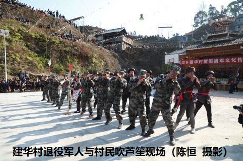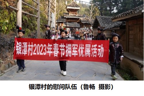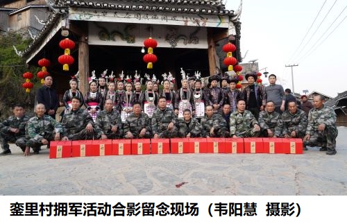尧贵村:尧贵村自上世纪60年代起,村民每年自发开展慰问现役军人家属活动,为军属挑柴挑水、春种秋收等日常农活事务,还将每户军属的实际困难列入村民委工作的重要内容,及时有效解决现役军人的后顾之忧,60余载拥军习俗始终如一。1月29日,该村村民自发集资,先后到8名现役军人家中进行走访慰问。在慰问当天,村民们有的吹着芦笙、有的敲锣打鼓、有的披披风、有的放鞭炮,大家分工协作。每到一户均详细了解军属的生产生活和身体情况,感谢军人家属对国防事业的支持和奉献,并送去新春祝福和慰问金,用实际行动表达对军人军属的爱戴和尊崇。同时,军属们为大家戴上红蛋、送上热茶、递上糖果,邀请大家一起就餐,对全村村民的关心与厚爱表示感谢。