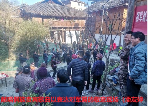 1月31日,趁着年味正浓,从江县谷坪乡银潭村开展了一场高规格的拥军活动。全村男女老少齐着盛装,一路敲锣打鼓、燃放鞭炮、吹着芦笙,分别到村里的两户现役军人家中进行慰问。每到一户,侗族姑娘与军属坐在一起,先献唱侗族贵宾歌曲以表达对军属的敬意,并送上为他们精心准备并有代表侗族最高敬人礼物的两只羊,有猪肉、稻田鱼、水果、糖和侗族年货,还有匾牌、柴火等等礼品,感谢他们为国防建设所作的贡献。