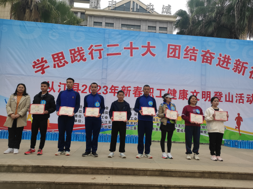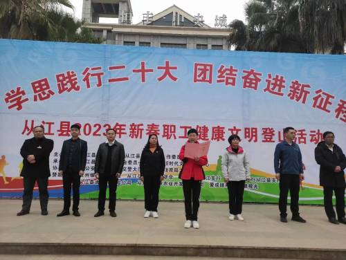 2月17日上午,从江县总工会、中共丙梅街道工作委员会共同举办的“学思践行二十大 团结奋进新征程”主题活动暨从江县2023年新春职工健康文明登山活动在从江县城中央城广场隆重举行。来自全县57名登山爱好者和17个县直机关单位、街道居委会代表队255名队员参加活动。从江县委常委、县委宣传部部长、统战部长赵灵芝,县人大常委会副主任、县总工会主席李大琼出席活动。