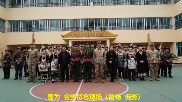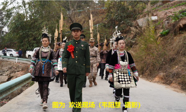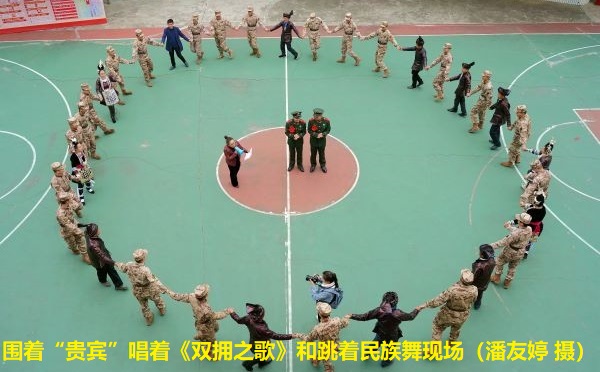 在欢送仪式前,自发前来欢送的村民衣着盛装、吹奏芦笙,按照当地少数民族最高礼节,把两名即将退役的士兵作为“贵宾”围在场地中央,大家与中队官兵手拉手围着“贵宾”唱双拥侗歌、跳侗族哆耶团结舞,以此来褒扬和欢送“贵宾”,现场气氛热烈,高潮迭起,呈现出浓浓的军民鱼水情。