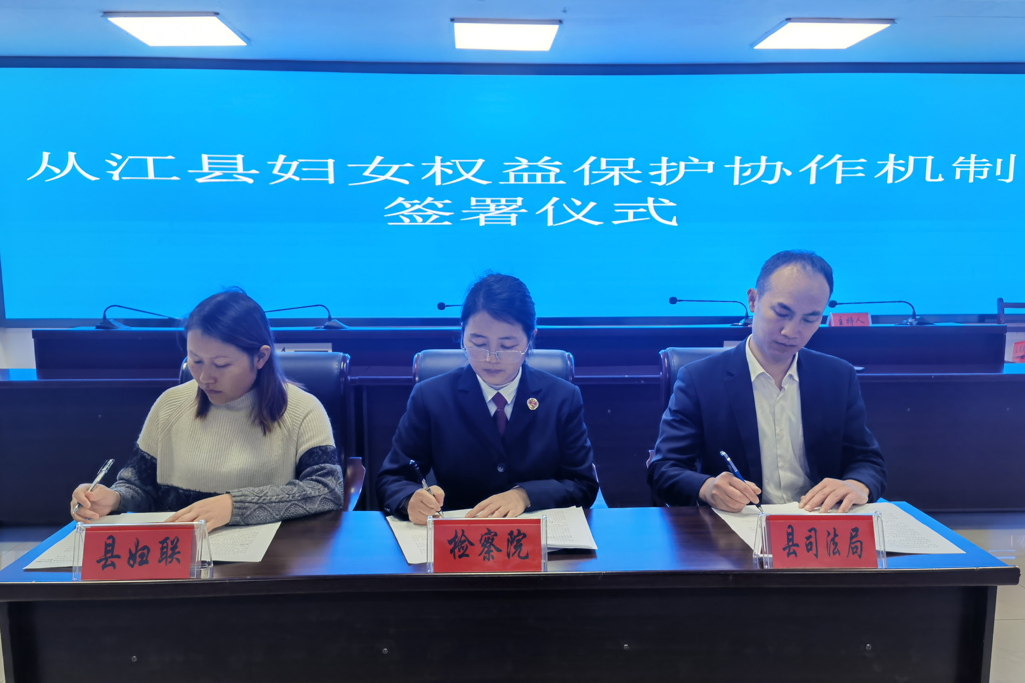 为进一步发挥检察机关、司法行政机关以及妇联职能优势,推进妇女权益保障工作落地生花,3月7日,在“三八”国际劳动妇女节即将到来之际,从江县人民检察院召开签订会,联合县妇联、县司法局共同签订《关于从江县妇女权益保护协作配合机制》(以下简称《机制》),为全县妇女送上“定制版礼物”。