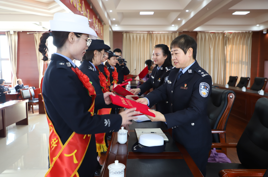 会上,党委委员、政工办主任郝君伟宣读了表彰决定,大队方珺同志被评为“2022年度巾帼民警标兵”,戈曌珍同志被评为“2022年度巾帼先进民警”。