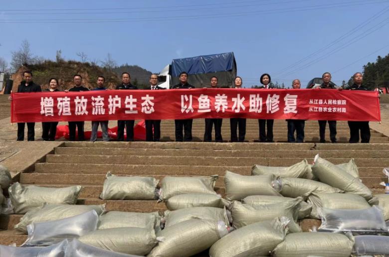 3月10日,从江县人民检察院联合县农业农村局开展公益诉讼增殖放流活动,本次增殖放流活动在县农业农村局渔业技术人员的指导下,由检察官、渔业执法人员、群众代表、案件当事人进行放流,3万余尾鱼苗在都柳江流域从江县四寨河水电站“安家”。