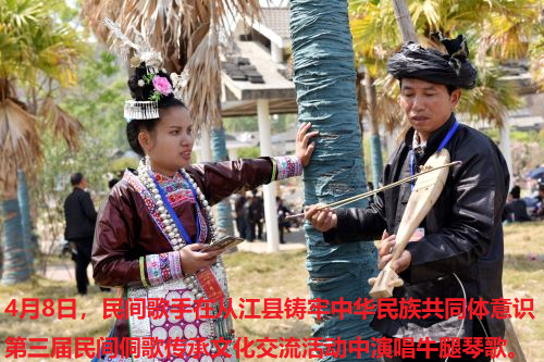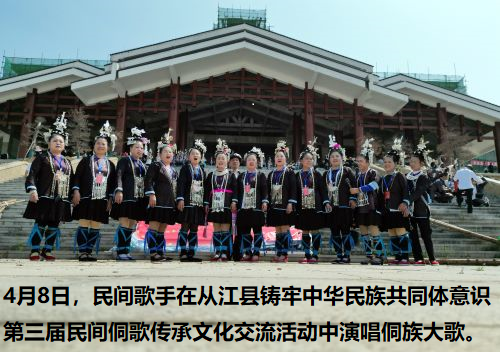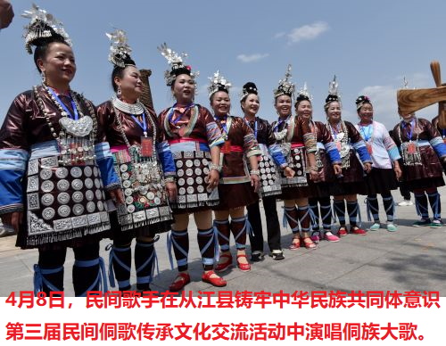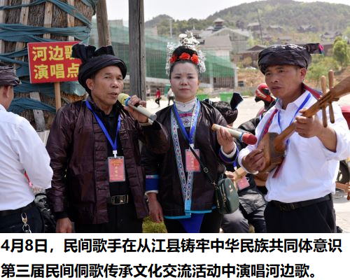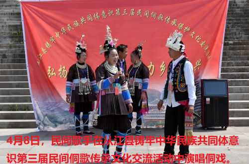4月8日,贵州省黔东南苗族侗族自治州从江县举行铸牢中华民族共同体意识第三届民间侗歌传承文化交流活动。此次活动来自本县、黎平县和广西三江县50支民间侗歌队550人参加,通过自己的歌声传承、弘扬和保护民族文化,助力乡村振兴。图为:4月8日,民间歌手在从江县铸牢中华民族共同体意识第三届民间侗歌传承文化交流活动中演唱侗族大歌。(从江县教育和科技局:龙梦前)