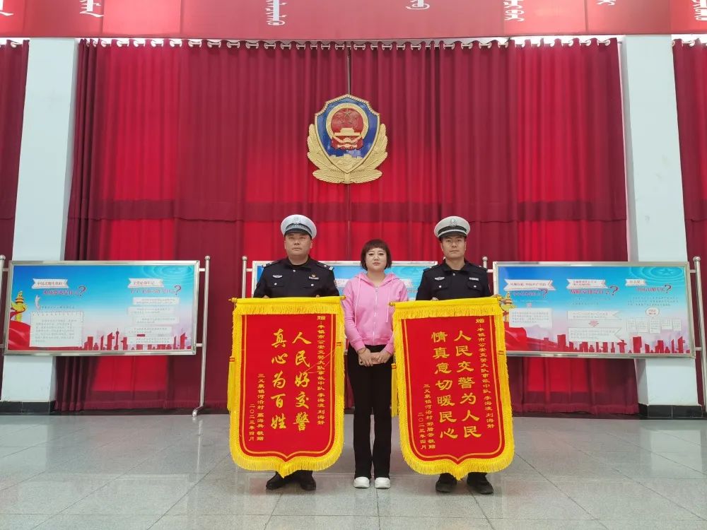 2023年4月25日上午,事故双方当事人向丰镇市公安局交管大队事故中队一组民辅警送上两面鲜红的锦旗,对事故中队民辅警认真负责的办案态度和专业能力表达了认可和感谢。交通事故发生后,为了维护当事人的合法权益,民警李海凌、刘海静耐心与双方当事人沟通,经过多次协调,双方终于达成和解协议。为表示感谢,双方当事人将写有“人民交警为人民 情真意切暖民心”、“人民好交警 真心为百姓”的锦旗送到了李海凌、刘海静的手中。