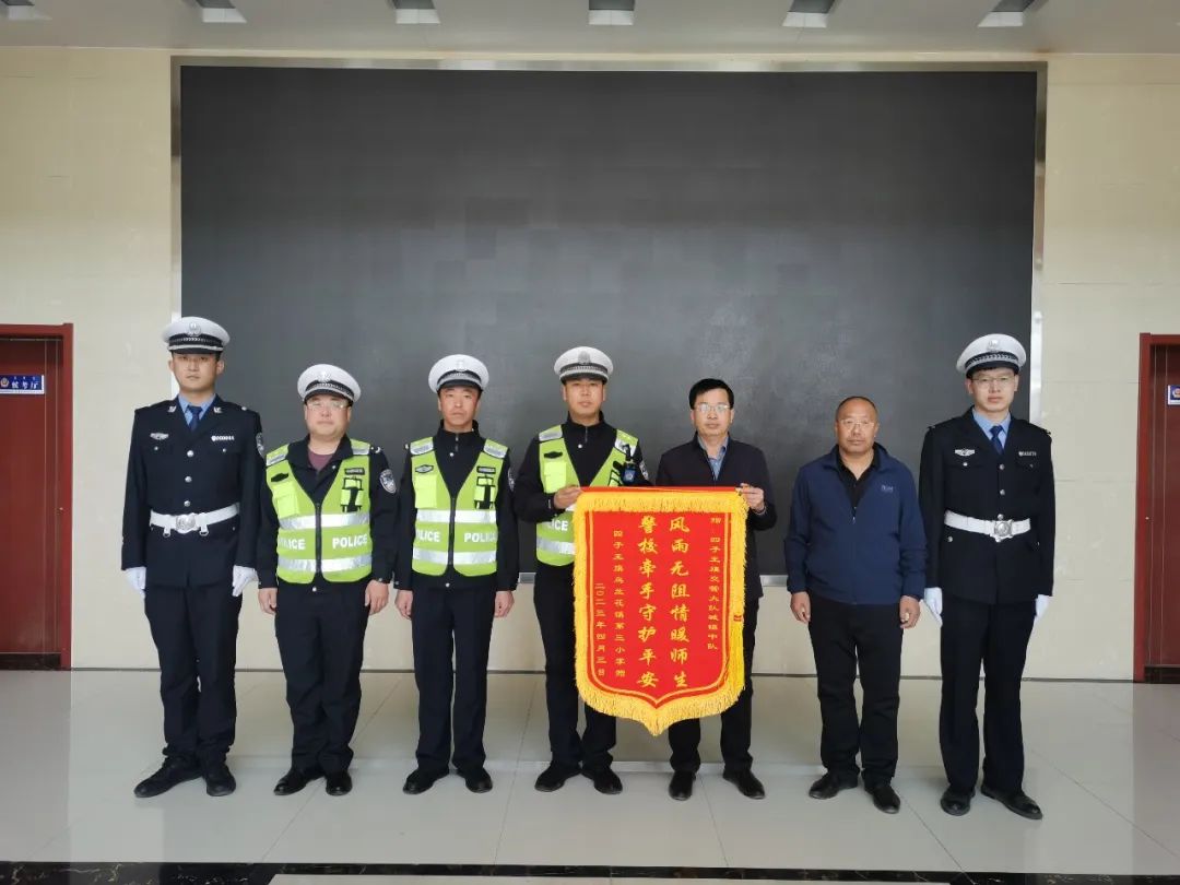 2023年4月17日,四子王旗第三小学的两位校长将一面印有“风雨无阻情暖师生 警校牵手守护平安”的锦旗送到大队,感谢四子王旗交管大队长期以来在学校设立“护学岗”,为维护校园周边道路交通秩序,保障学生上、下学期间道路交通安全,创造了良好的道路交通环境。