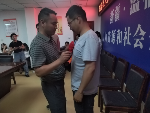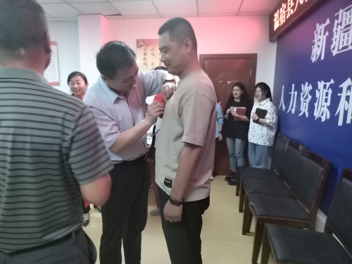 近日,该县人社局在全局系统内组织开展了2023年度“最美人社人---每周之星”评选活动,温宿县人社局党组成员、公共就业服务局局长魏勇给为“每周之星”佩戴表彰花环。(江凯摄)