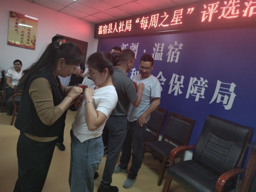 为全力推进人社局机关“五好”党支部创建、“四个合格”党员队伍建设。近日,该县人社局在全局系统内组织开展了2023年度“最美人社人---每周之星”评选活动,县委组织部副部长、县人社局党组书记、副局长杨海东同志为“每周之星”佩戴表彰花环并表示祝贺。(江凯摄)