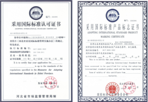 近日,经邯郸市市场监督管理局组织评价和审查,新兴铸管股份有限公司生产的“排水工程用球墨铸铁管、管件和附件”产品,采用ISO 7186:2011国际标准,符合使用采用国际标准产品标准的要求,获得了国家标准化管理委员会颁发的“企业产品采用国际标准认可证书”及“采用国际标准产品标志证书”。