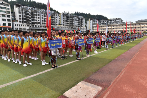 当日上午,伴随着高亢激昂的进行曲,各校运动员代表队迈着整齐的步伐、喊着响亮的口号先后走过主席台,充分展示全县中小学生的蓬勃朝气和体育健儿的风采,将现场气氛推向一个又一个高潮。开幕式上,运动员、裁判员代表分别上台作了宣誓。与会嘉宾、广大师生共同观看了县城学校1200余名学生带来的《花开时节》《鼓舞踏山河》《我和我的祖国》《万疆》《超越梦想》等大型文艺表演活动。