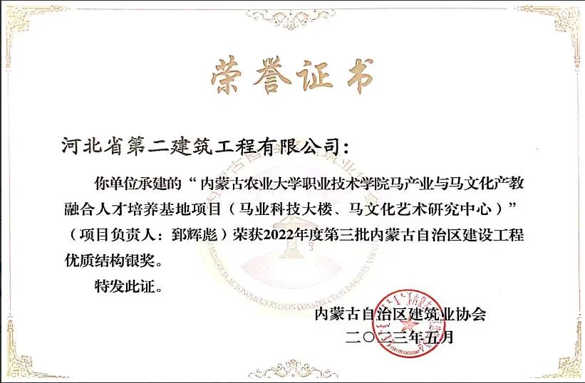 近日,由内蒙古自治区建筑业协会组织评审的“2022年度内蒙古自治区建设工程优质结构奖”名单公布,河北建工省二建九分公司内蒙古农业大学马文化项目(马业科技大楼、马文化艺术研究中心)荣获“2022年度内蒙古自治区建设工程优质结构奖”。