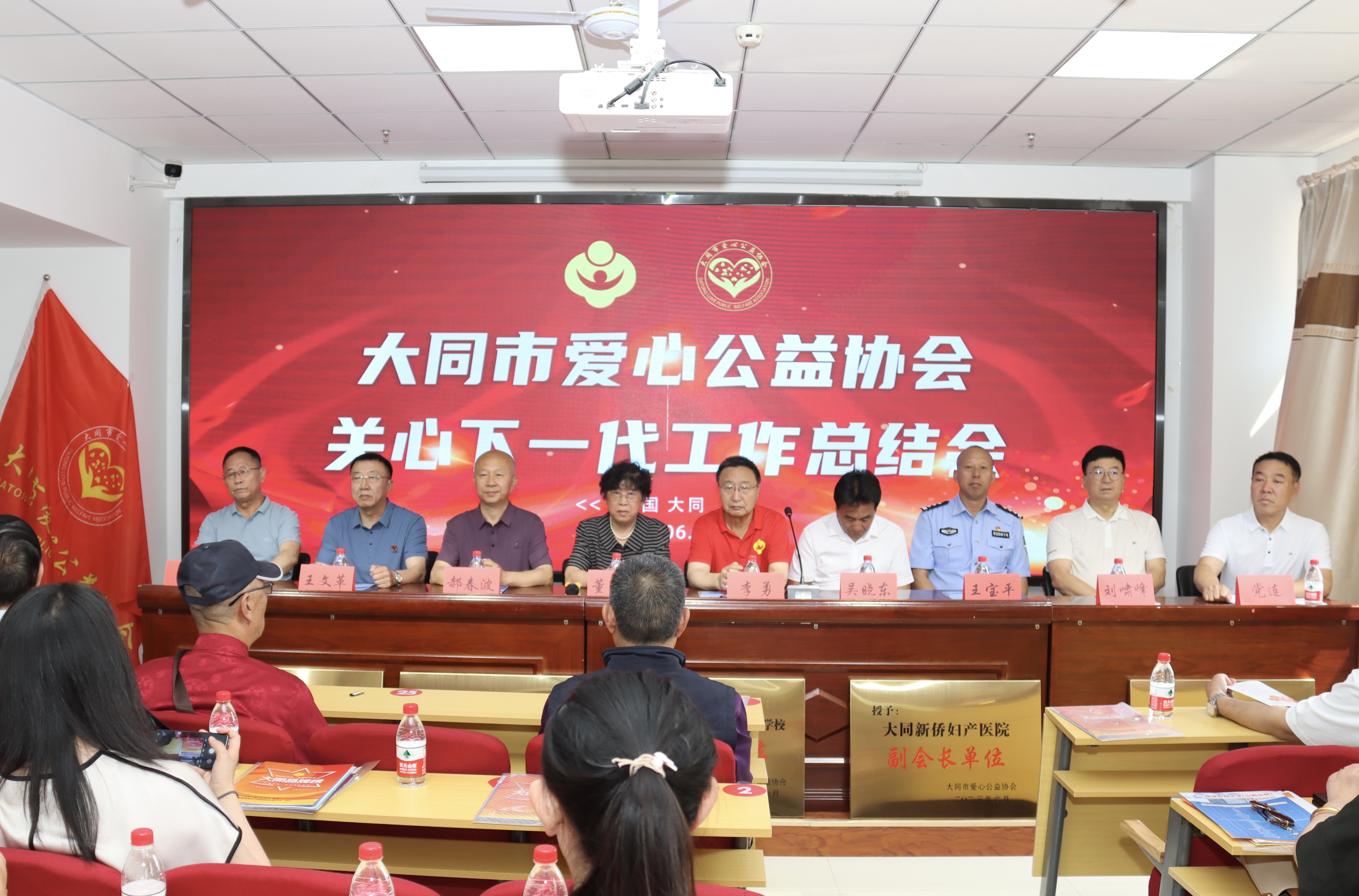 大同市关工委主任董变英出席会议。大同市关工委副主任李勇、大同市关工委委员郝春波、大同市爱心公益协会关工委主任吴晓东、山西法治报驻大同记者站主编王文革、大同市交警支队党委委员,一大队大队长王宝平、中共山西党史学会副会长,新侨妇产医院党支部书记景京、国家一级律师,大同市政府法律顾问刘啸峰、以及爱心企业代表、爱心志愿者60余人参加会议。