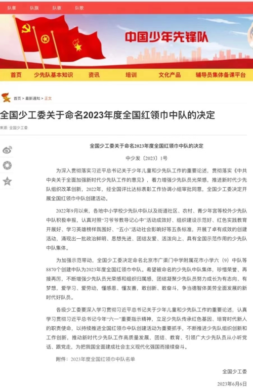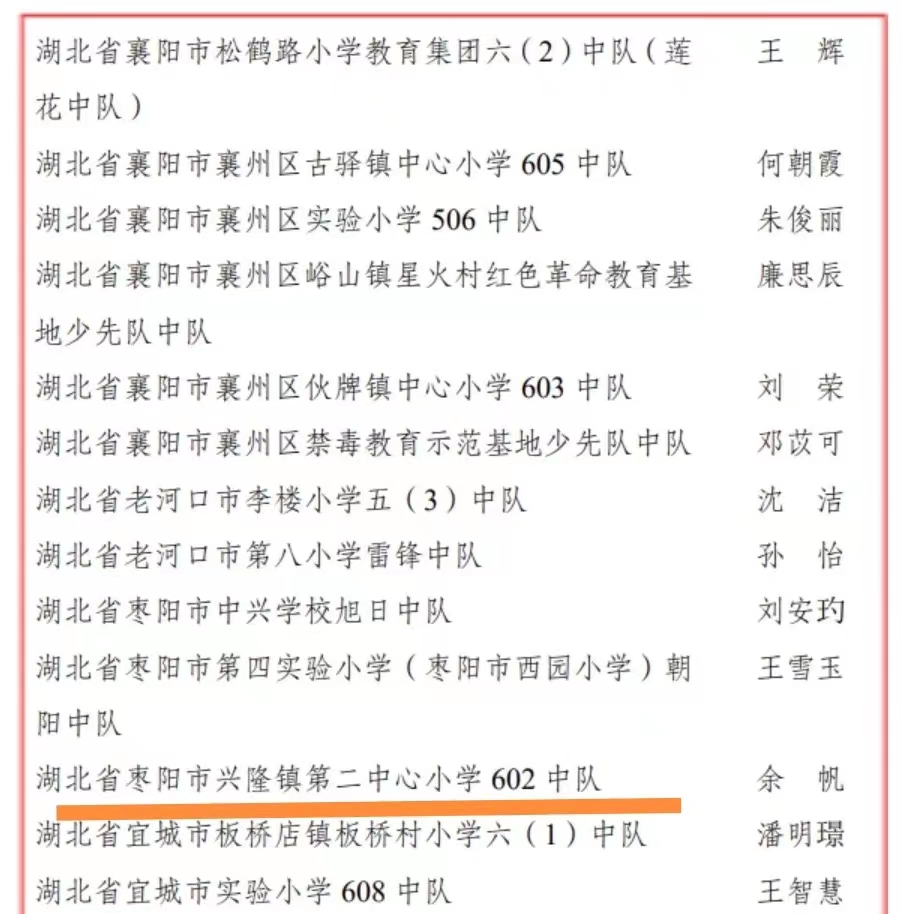 近日,全国少工委公布了获得“全国红领巾中队”称号的少先队中队名单,枣阳市兴隆镇第二中心小学602中队名列其中,被命名为全国红领巾中队。据悉此次襄阳市共有三十个中队获此殊荣,兴隆镇第二中心小学是枣阳市唯一一所获得该荣誉的农村学校。