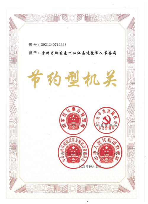近日,笔者从从江县退役军人事务局获悉,该局被国家机关事务管理局、中央直属机关事务管理局、国家发展和改革委员会、财政部等四部门联合表彰为“节约型机关”。