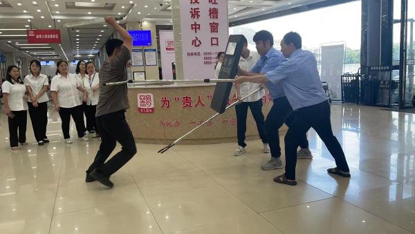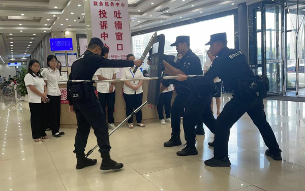 演练开始前,特勤警向大厅人员详细讲解了钢叉、警用盾牌、橡胶警棍等器械的使用方法和技巧,并进行了操作演示。演练活动开始,由一名特勤警扮演的暴力分子手拿凶器突然闯入政务大厅,保安人员发现后立即报警并通知大家加强戒备,保安人员迅速手持钢叉、盾牌、多功能抓捕器对恐怖分子进行拦截,坚决不能让恐怖分子进入群众办事密集区域,经过一番激烈搏斗,暴力分子被保安人员制服在楼梯死角,整个演练过程紧张有序,取得了良好的效果。