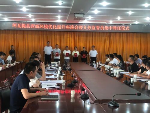 为进一步优化提升营商环境,广泛听取各界意见建议,充分发挥社会各界监督作用,7月26日,阿瓦提县举行营商环境优化提升座谈会暨义务监督员集中聘任仪式。县委常委、纪委书记、监委主任苗向军,县委常委、县政府常务副县长楚伟涛,县优化营商环境领导小组成员单位主要领导,拟聘任营商环境监督员,企业、个体工商户代表共120余人参加会议。