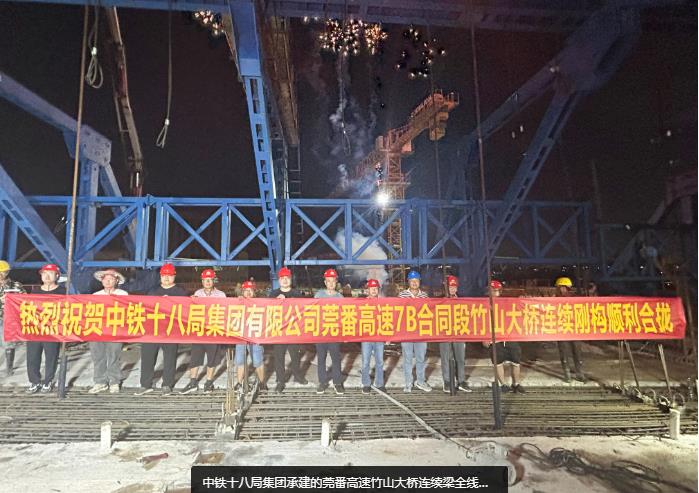 日前,随着最后一方混凝土浇筑完成,中铁十八局集团承建的莞番高速竹山大桥连续梁全线顺利合拢,这标志着莞番高速公路又取得突破性进展,助力粤港澳大湾区建设。