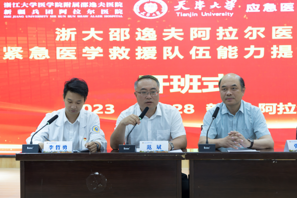 浙大邵逸夫阿拉尔医院党委副书记、院长张雷在致辞中表示,新疆地处亚欧大陆中心、丝绸之路经济带核心区,提高新疆,特别是南疆区域医疗应急工作水平,对提高当地卫生健康影响力具有重大意义。此次培训带来的国内外卫生应急领域的最新进展,将全面提升医院救援队伍现场紧急医学救援处置能力,推进医疗救援信息化指挥、立体化伤员转运、大批量伤员救治、紧急医学救援培训演练和专业人才培养,夯实国际紧急医学合作和救援能力。希望能与天津大学应急医学研究院进一步加强交流合作,大力开展应急救援学科建设、人才培养、科技研发与转化、培训演练等工作,全面提升浙大邵逸夫阿拉尔医院紧急医学救援和对突发事件快速、有效、安全的应急处置能力。