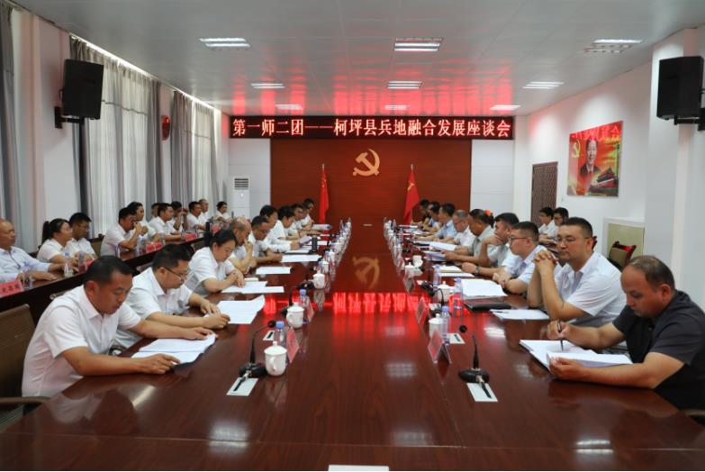 二团与柯坪县唇齿相依,双方聚焦新疆工作总目标,完整准确落实新时代党的治疆方略,在联合演练、区域联防、共同防雹等领域合作共赢,促进经济社会融合发展;双方向结合部、国道边靠拢倾斜,布局谋划,形成兵地共建产业带,造福各族干部群众;深入推进兵地融合发展重点任务,在农业、畜牧业、旅游等方面找差距、补短板,加强合作共建,打造示范样板项目工程,共同书写兵地融合发展新篇章。