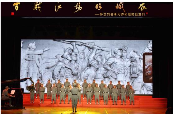 主题演出由八路军研究会文工团携手来自中央民族歌舞团、中国音乐学院、中华全国总工会文工团等的多位艺术家,通过独唱、合唱、诗朗诵等众多节目,以红军时期、抗战时期、解放战争时期、军事教育时期四个篇章为轴线,对《十送红军》、《太行山上》、《我的祖国》等经典革命歌曲进行倾情演唱。耳熟能详的旋律结合现场历史解读和荧幕照片呈现,为现场观众带来了一场重温老一辈革命家艰苦卓绝峥嵘岁月的视听盛宴,从各个时期展现了刘伯承元帅的丰功伟绩,激励后人铭记历史,缅怀前辈和先烈,传承红色基因,永远跟党走,奋发砥砺前行,演出现场不时爆发出阵阵热烈掌声。