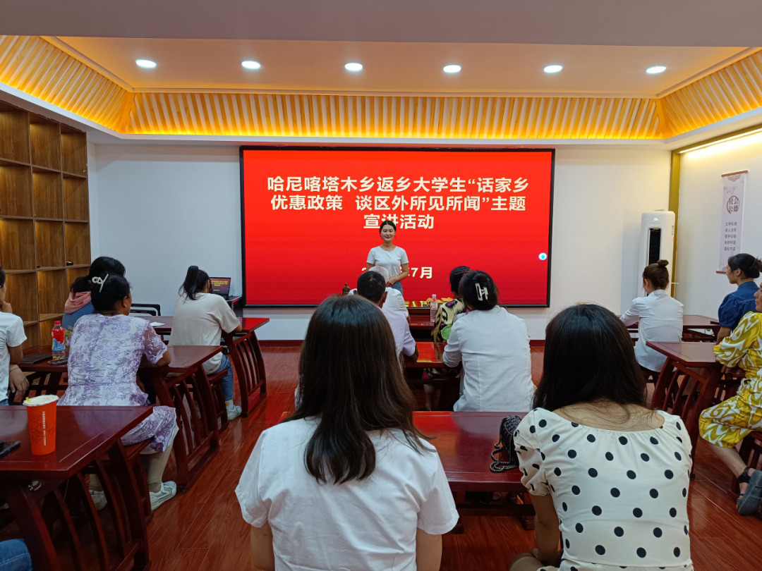 库车市哈尼喀塔木乡组织辖区内返乡大学生开展“话家乡优惠政策 谈区外所见所闻”主题宣讲活动。返乡大学生志愿者用群众愿意听、喜欢听的身边好事、喜事、大事为载体,宣传党和国家利民、惠民、富民等一系列优惠政策,将自己在疆内外的所见所闻所思所感讲出来,与干部群众分享,进一步激发了干部群众建设家乡的责任感和使命感。
