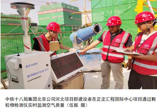 为打造绿色文明工地,实现节能、环保、低碳,河北项目群把一系列节能环保措施穿插在工程施工过程中,汇程国际中心项目部安保部副部长庞富贵“如数佳珍”介绍:临时道路铺设预制块,将临时道路由传统混凝土硬化改为装配式预制路面,可多次重复周转使用,减少建筑垃圾;通过颗粒物检测仪实时监测空气质量;采用绿色环保的全钢爬架和铝模板施工工艺;为节约用电,安装了太阳能路灯;为节约用水,使用红外感触控制开关,设立了雨水回收系统,配备360度智能冲洗台;使用节能电器,做到人走断电;使用节能空调、冰箱等电器;非特殊资料采用双面打印和电子存档,节约用纸;工区、办公区闲置空地,全部种植草种和花草,减少不必要的场地硬化面积;对临时裸露土地,及时铺设绿网;对易产生粉尘的工序,采取全封闭施工措施;对运输容易散落、飞扬、流漏物料的车辆全部采取密封处理。为有效控制施工噪声,项目部选用低噪音设备和施工工艺,操作人员对可能产生噪音的部位定期清理、润滑、保养,将噪音量控制到最低。