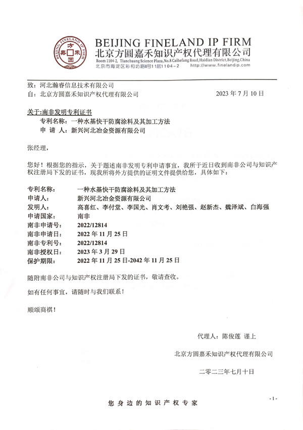 近日,新兴河北冶金资源有限公司《一种水基快干防腐涂料及其加工方法》发明专利获得南非公司与国家知识产权局注册下发的证书。