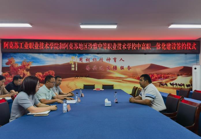 为贯彻落实国家、自治区《关于深化现代职业教育体系建设改革的意见》相关要求,不断深化现代职业教育体系建设改革,推进中高职一体化建设,8月28日,阿克苏地区沙雅中等职业技术学校与阿克苏工业职业技术学院双方本着“优势互补、资源共享、互惠双赢、共同发展”的原则,签订了《关于推进中高职一体化建设协议书》。