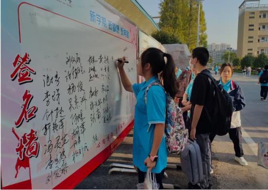 沐浴着晨光,学生陆续走进整洁亮丽的校园。校园彩旗飘舞,国旗飘扬,道路两旁的盆栽绿植生机盎然,叶上晨露欲滴,红花似火。电子屏亮起来了,广播响起来了。学生们兴奋地在签名墙上留下平安返校的签名,班主任们给学生注册、住宿登记、充饭卡、安排座位等,一切井然有序。在新的学期,学生心中憧憬着新的希望,脸上洋溢着幸福的微笑。