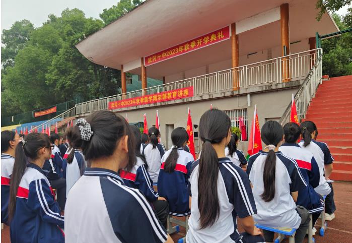 为促进学校民主法治建设和学生法治教育工作,切实将安全防范知识和法律法规带进校园,进一步提高中学生的法律知识和自我防范意识。9月7日上午,武冈十中全体师生相聚大操场隆重举行2023年秋季开学典礼,集中开展法治教育专题讲座,特别邀请了学校法制副校长、武冈市人民检察院副检察长李泽民和未成年人检察办公室主任华丽莎一行走进校园,为全校师生开展了一场非常精彩的法治教育专题普法讲座。
