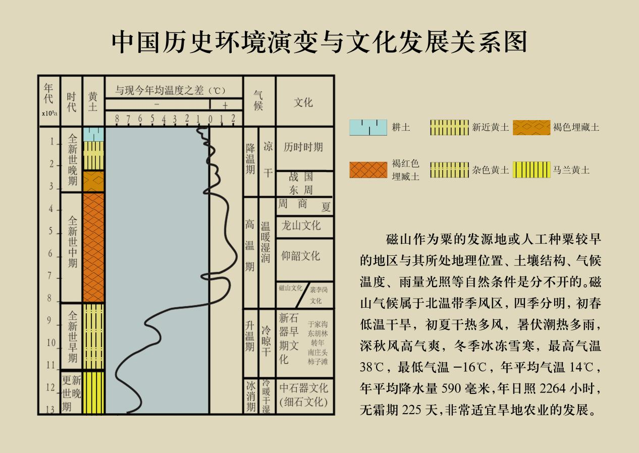 磁山遗址作为世界粟的发祥地,与其所处地理位置、土壤结构、气候温度、雨量光照等自然条件是分不开的。现在一般认为,我国黄河流域原始农业并非开始于黄河泛滥平原或可灌溉地区,而是起源于与平原接壤的黄土高原或丘陵山地一带,这是因为“高毋近旱,而水用足;下毋近水,而沟防省”(《管子·乘马》记载)的地方,实属早期人类生存的理想空间和最佳选择。磁山遗址位于洺河北岸台地,高出河床约25米,地处太行山东麓的山前地带,海拔高度260米,四周山峦起伏,沟壑纵横,台地连绵,土壤为红、黄黏土,具有良好的保水和供水性能,十分肥沃,气候属北温带季风区,四季分明,非常适宜旱地农业的发展。磁山先民也没有辜负大自然的慷慨恩赐,以自己的聪明才智和辛勤劳动在此率先培育出了目前世界上最早的人工种植的农作物“粟”,使我国原始农业向前迈进了一大步。