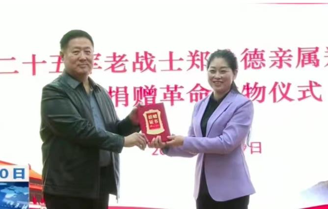 10月29日,红二十五军老战士郑执德之子郑光、郑执德之女郑丽专程回到家乡湖北省英山县向长征国家文化公园英山园区捐赠革命文物。中共英山县委书记郑光文,县委副书记、县长王海霞等县“四大家”领导在长征国家文化公园英山园区游客接待中心参加捐赠仪式。