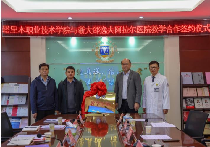 近日,塔里木职业技术学院党委副书记、院长周志国一行7人莅临浙大邵逸夫阿拉尔医院,与医院王志强书记等院领导以及部分科室主任在党委会议室亲切座谈并签订教学合作协议,活动由浙大邵逸夫阿拉尔医院副院长谭塔林主持。