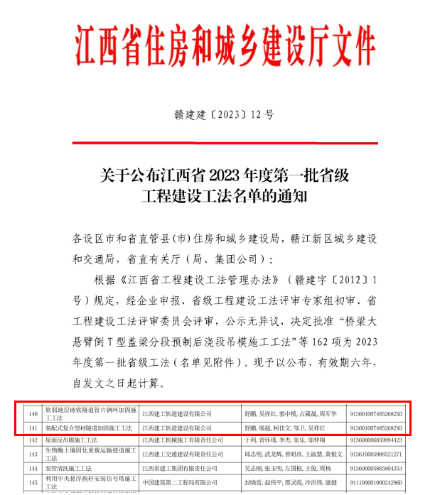 近日,由江西建工轨道建设有限公司编写的《软弱地层地铁隧道管片钢环加固施工工法》、《装配式复合型材隧道加固施工工法》荣获江西省2023年度第一批省级工程建设工法,这是公司首次在地铁隧道领域获评省级工法,也是获奖工法数量最多的一次,创历年最好成绩。