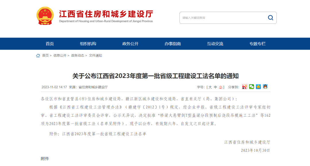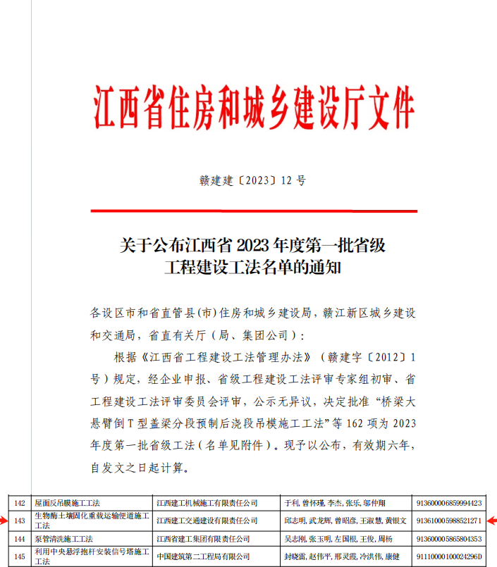 近日,江西省住房和城乡建设厅网站公布了江西省2023年度第一批省级工程建设工法名单,江西建工交通建设有限责任公司申报的“生物酶土壤固化重载运输便道施工工法”成功入选。