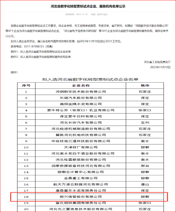 按照河北省关于企业数字化转型贯标试点工作要求,新兴铸管股份有限公司积极参与,经邯郸市工信局审核推荐、专家评审、省厅研究,最终入选《河北省数字化转型贯标试点企业名单》。