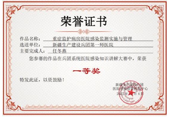 第一师医院感染管理办公室任冬燕的参赛作品《重症监护病房医院感染监测实施与管理》在首届兵团系统医院感染知识讲解大赛中荣获一等奖