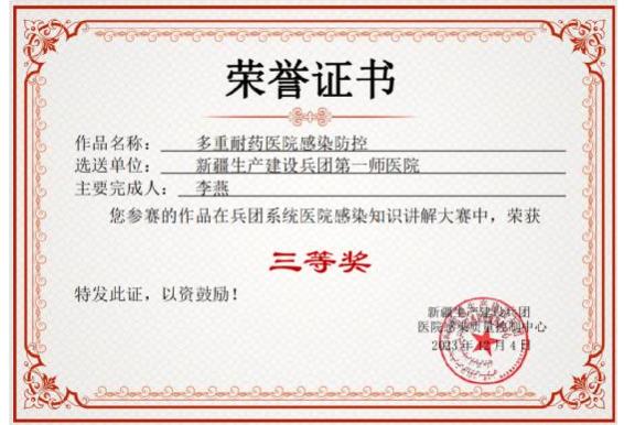 第一师医院感染管理办公室李燕的参赛作品《多重耐药医院感染防控》在首届兵团系统医院感染知识荣获三等奖