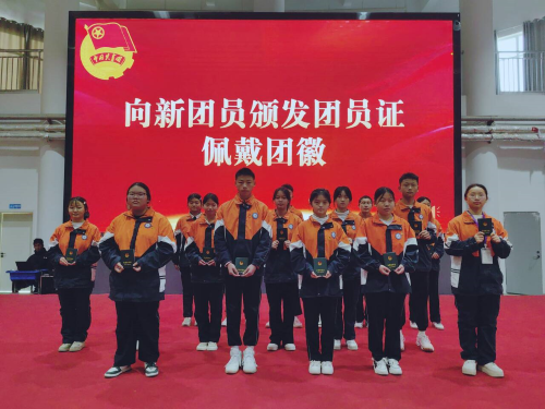 仪式中,塔里木中学校领导为新团员佩戴团徽,在鲜艳的团旗下,将党赋予新一代青年的责任和使命接续传承。光荣的新团员郑重举起象征誓言的右手。誓言铿锵有力,礼堂庄严肃穆,这是新团员在向党和团组织表达自身的忠诚和奋斗决心。