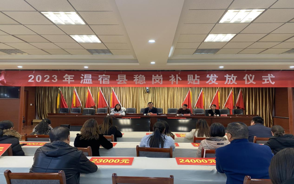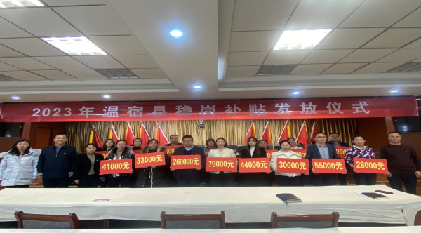 12月13日,新疆阿克苏地区温宿县人社局举行2023年温宿县企业稳岗补贴发放仪式,向温宿县曦隆燃气开发有限公司、新疆温宿农村商业银行股份有限公司等50家企业代表发放稳岗返还资金249.35万元,惠及871家企业4052名企业员工。县委组织部副部长,县人社局党组书记、副局长,县技工学校校长杨海东出席发放仪式。