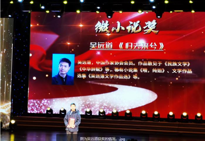 12月16日,中国作家协会主管的国家级大型文学选刊《小说选刊》“包公故里杯.优秀小说奖”颁奖典礼在包公故里安徽合肥市肥东县举行。湖北黄冈市作家吴远道的《归去来兮》等3部作品获优秀微小说奖,也是湖北省唯一的获奖作家。