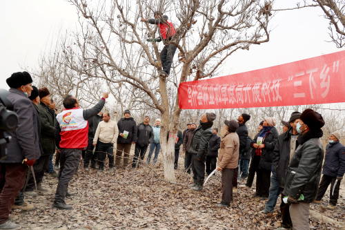 乌什县依麻木镇玉斯屯克和田村林果业示范田里,由乌什县林业和草原局举办的林果业技术培训正在进行,专家从果树修剪、病虫害防治、科学施肥管理等方面进行了详细的讲解,通过手把手教技术、传经验,让广大种植户全面的了解果树管理方面的知识。