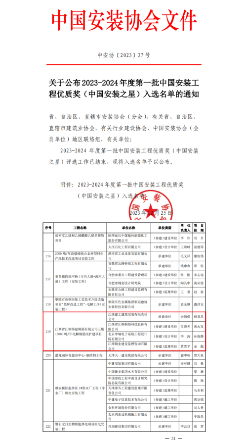 近日,中国安装协会公布了2023-2024年度第一批安装工程优质奖(中国安装之星)入选名单,江西建工建筑安装有限责任公司(简称江西建工安装)承建的“江西省江铜耶兹铜箔有限公司三期 15000 吨/年电解铜箔改扩建项目”光荣上榜!
