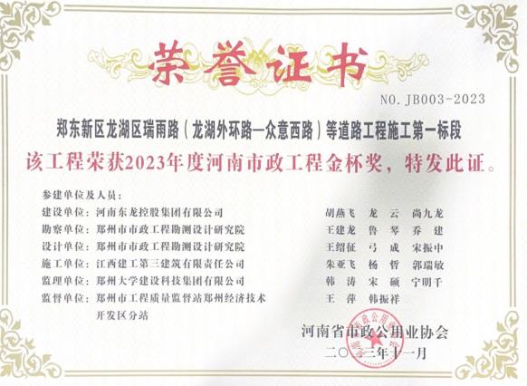 近日,由江西建工第三建筑有限责任公司(简称:江西建工三建)承建的郑东新区龙湖区瑞雨路(龙湖外环路-众意西路)等道路工程施工第一标段荣获2023年度“河南市政工程金杯奖”;郓城县南城名苑住宅小区(10#-19#、S3#、S5#-S8楼、幼儿园地下车库)获评2023年度菏泽市建筑施工安全文明标准化工地。