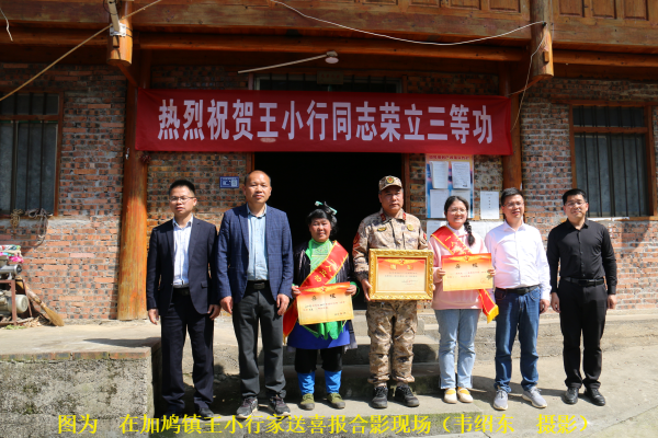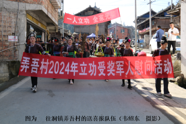 每到一处,村民们得知喜报传来,自发组成芦笙队,吹着芦笙、敲着锣鼓、挑着木柴、提着礼品、燃放鞭炮,用最淳朴而隆重的方式表达对现役军人立功的尊崇和爱戴。